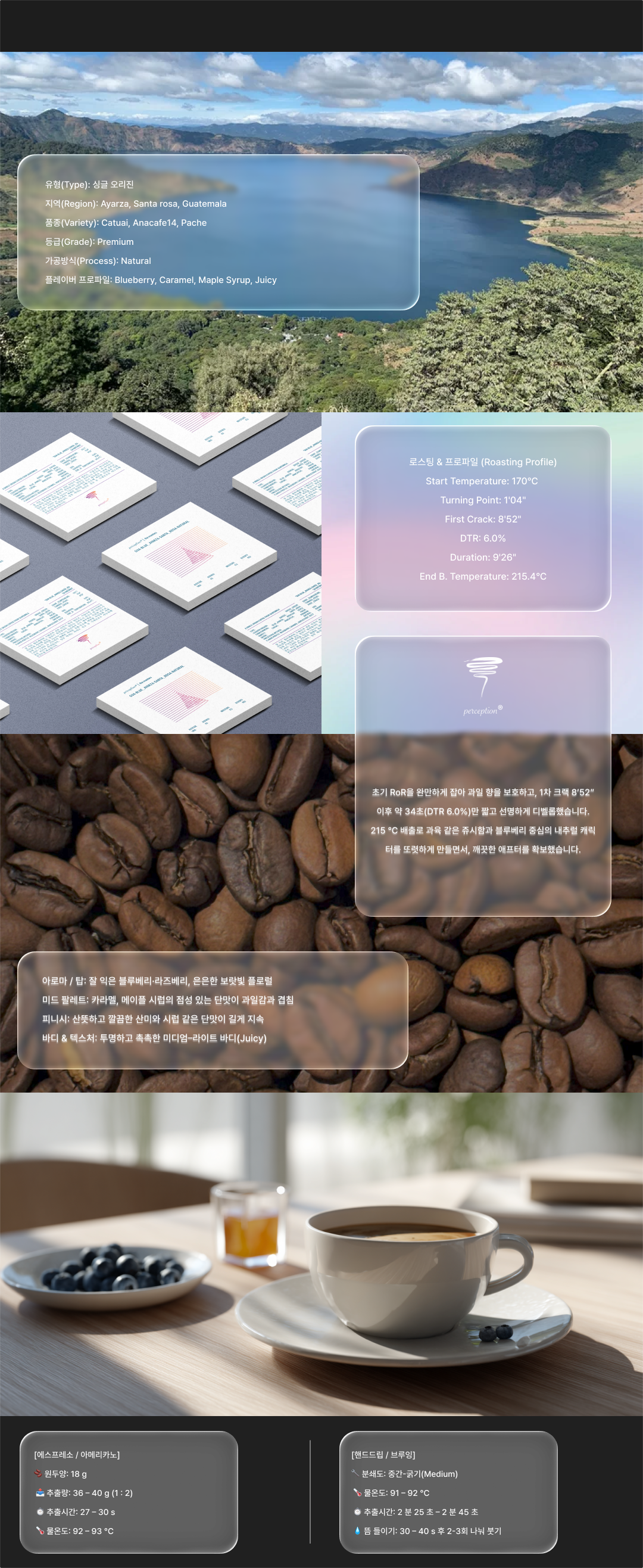 | 유형(Type): 지역(Region): 품종(Variety): 등급(Grade): 가공방식(Process): 플레이버 프로파일: | 싱글 오리진 Ayarza, Santa Rosa, Guatemala Catuai, Anacafe14, Pache Premium Natural Blueberry · Caramel · Maple Syrup · Juicy |